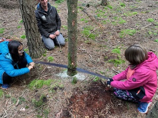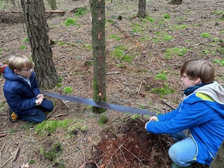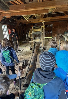 Fällen eines Baumes und anschließender Besuch im Sägewerk.