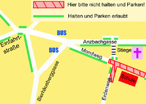 Eine besondere Bitte an alle Eltern, die ihre Kinder mit dem Auto zur Schule bringen oder abholen: Parken oder halten Sie zum Ein- und Aussteigen lassen Ihres Kindes nur dort, wo Sie die Sicherheit Ihrer und anderer Kinder nicht gefährden, also keinesfalls unmittelbar vor den Schutzwegen! Lieber ein bisschen weiter weg parken und die letzten Schritte gemeinsam mit dem Kind zurücklegen – sehen Sie es als ein Geschenk an Ihr Kind für einen guten Start in den Tag!