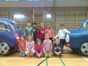 mit den Kindern durchbesprochen. Dafür standen eine simulierte Fahrbahn mit Kreuzungsbereich und Zebrastreifen sowie aufblasbare Autos zur Erarbeitung der "Sichtlinie" zur Verfügung.