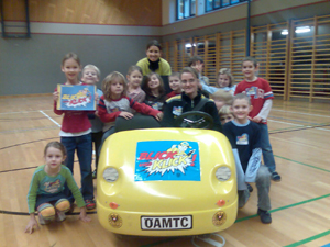 Um die Verwendung von Rückhaltesystemen "Kindersicherungspflicht" eindringlich zu demonstrieren, erfühlen die Kinder in einem eigens konstruierten Elektroauto, wie sie bei einer Notbremsung mit der richtigen Rückhaltevorrichtung gesichert sind. Eine daneben sitzende Puppe ohne Gurt kippt bei diesem Bremsmanöver haltlos nach vorne.