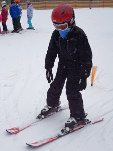 Die Kinder und die LehrerInnen (und natürlich die Frau Direktor) waren mit Feuereifer dabei und carvten über die verschneiten Hänge. Da ging's ständig den Berg rauf und runter bis zum Mittags-Einkehr-Schwung.
