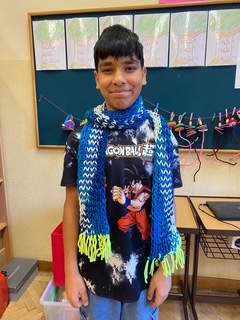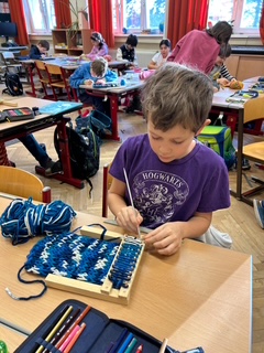 Jede freie Minute, teilweise schon vor Unterrichtsbeginn und in den Pausen wird mit Eifer am Strickrahmen gearbeitet, denn alle wollen z.B. ihren Schal zeitnah fertig haben.